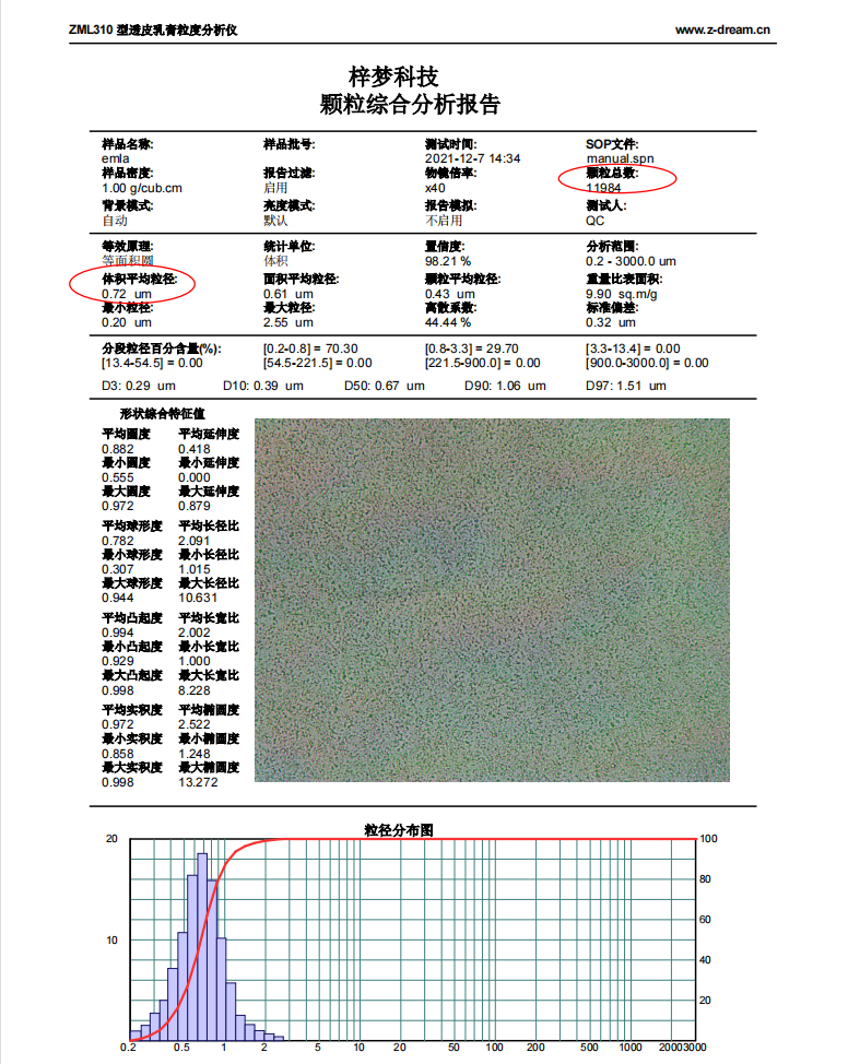 3)調節到最佳視野后利用透皮乳膏粒度分析儀ZML310分析軟件進行抓取圖片,識別圖片中的顆粒,并自動快速分析出顆粒數量,給出D10、D50、D90等參數,識別視野中的顆粒并給出粒度分布,并可以按照不同的粒形進行過濾分析。