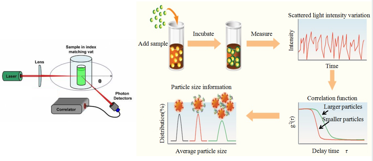 上面是一個傳統(tǒng)的動態(tài)光散射原理的示意圖,其基本原理是一束激光照在樣品池的里面,樣品池里有納米顆粒,然后二極管進行檢測,檢測以后送入一個相關(guān)器,相關(guān)器對信號進行處理,處理以后送入電腦得出顆粒粒度的結(jié)果。這樣的一個檢測過程是需要足夠多的數(shù)據(jù)支持的,所以它的測量結(jié)果由幾十秒到幾百秒,具體多少時長需要取決于顆粒粒度的大小,實際上對于光散射法DLS來說,當一束激光照在納米顆粒粒度上的時候,它的散射并不是在特定的角度上的,而是在整個空間里面發(fā)生的,所以它的信號在整個空間上是雜亂無章的,是無規(guī)則的。這就提示我們,我們可以用一個相機的傳感器來記錄空間的光的散射,傳統(tǒng)的光散射原理的操作方法是我們?yōu)榱双@得大量的數(shù)據(jù),需要很長的時間來進行測量;現(xiàn)在可以同時用很多的傳感器來進行測量,也就是用時間換取空間的概念,這樣我們就可以在一瞬間得到很多信號,這樣可以大幅度的縮減測量時間,可以快速的測量結(jié)果。