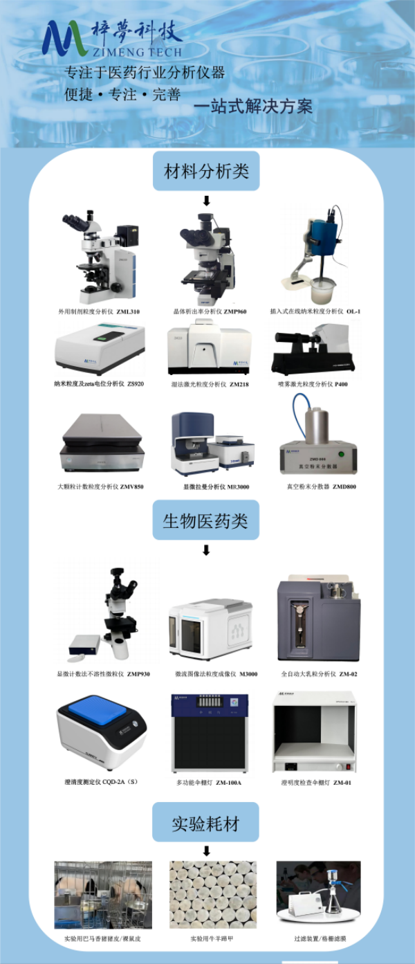 上海梓夢科技有限公司是一家專注于醫藥行業分析儀器的高新技術企業,其主營產品有晶體析出率分析儀、激光粒度分析儀、外用制劑粒度分析儀、光阻法顆粒計數器、顯微拉曼粒度儀、粒度粒形顏色分析儀、納米粒度及zeta電位分析儀、在線納米粒度儀、流式圖像法分析儀、在線圖像法粒度儀、全自動澄清度測定儀、澄清度檢查專用傘棚燈、可見異物檢查專用傘棚燈、顯微計數法不溶性微粒儀、透皮乳膏粒度晶型分析儀、真空粉末分散器等。