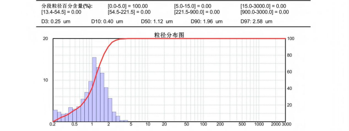 D50:1.12μm(50% 顆粒的粒徑小于此值,即中位徑),作為粒度分布的核心指標,此數(shù)值表明樣品中半數(shù)顆粒粒徑在 1.12μm 左右,處于外用制劑透皮吸收的適宜范圍;