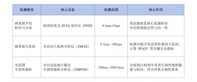 針對注射用脂肪乳從基礎粒徑測試到安全風險微粒管控的全流程需求,方案分維度配置檢測設備,精準匹配不同檢測目標: