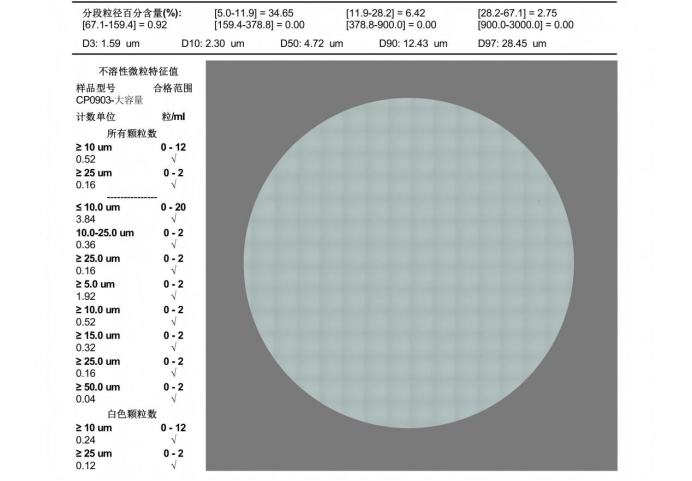 2)粒徑分布:聚焦于藥典規定的≥10μm和≥25μm等關鍵粒徑區間的微粒數量進行精準統計,可直觀呈現不同大小微粒的分布比例,為產品質量控制提供全面的粒徑分布數據支持,幫助用戶深入了解脂肪乳制劑中不溶性微粒的整體分布特征。