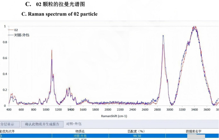 第二批樣品中,纖維素顆粒與 “外包裝” 匹配度 99.50%、與 “紙屑” 匹配度 94.77%,進一步鎖定異物可能來自產(chǎn)品包裝開封或轉運環(huán)節(jié);