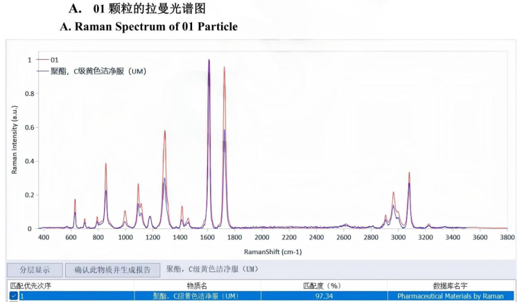 a.案例佐證:在某批樣品中,聚酯顆粒與 “C 級黃色潔凈服”“無塵布” 的匹配度達 97.34%,結合生產(chǎn)流程可推斷異物可能來自潔凈區(qū)人員著裝脫落;
