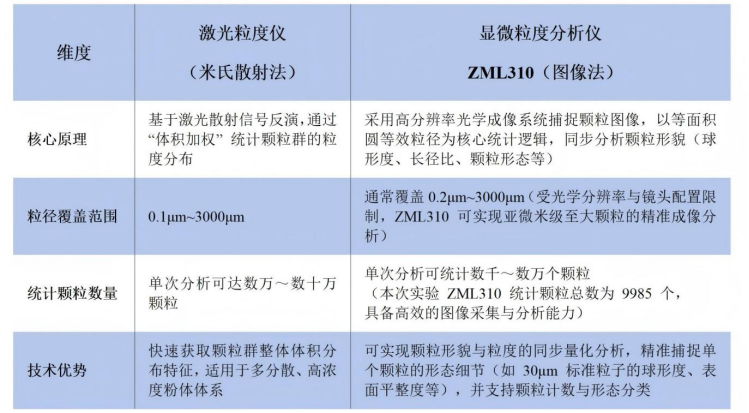在顆粒粒度分析領域,激光粒度儀與顯微粒度分析儀是兩類具有代表性的檢測儀器,它們基于不同原理實現對顆粒粒度的分析,在核心數據呈現上也存在差異。本文以 30μm 標準粒子為研究對象,聚焦顯微粒度分析儀 ZML310與激光粒度儀的檢測報告,從技術原理、核心數據差異、應用價值三個維度,深入剖析兩種儀器在粒度分析中的特性與適配場景。