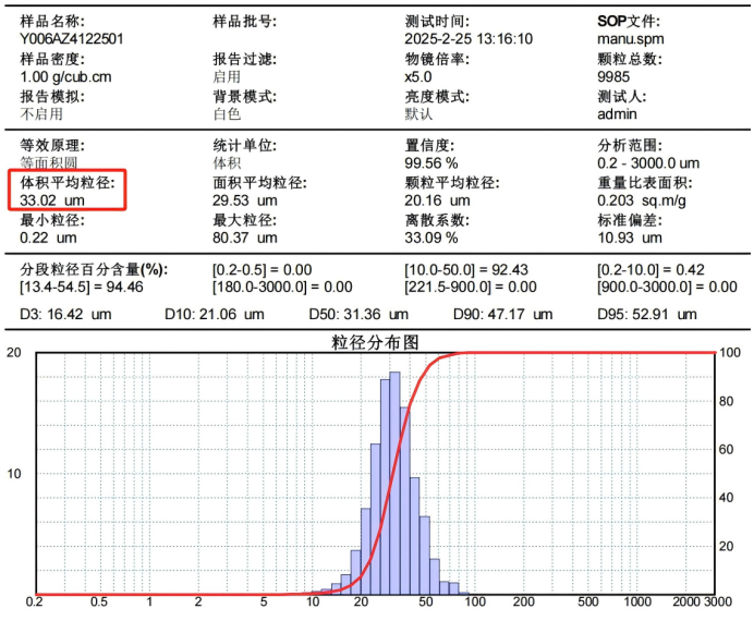 顯微粒度分析儀 ZML310 的體積平均粒徑為33.02μm。